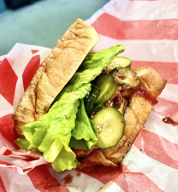 食パンバンズの中は、パテ×2、チーズ×2、トマト、レタス、ピクルス≒♾️、100%手作り、100%無化調の肉汁溢れる出来たてハンバーガーは旨い!