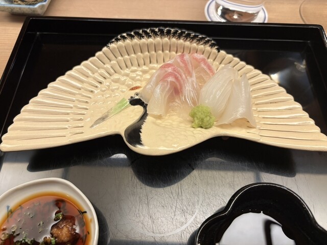 お造り。鶴の華やかな器でおめで鯛ですね。