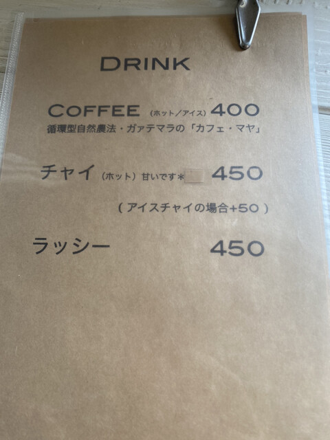 チャイとコーヒーはランチセットで+250円で頼める。単品だとこれくらいかかる。
