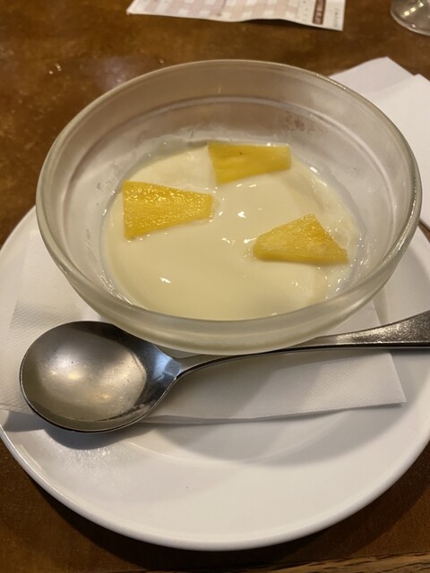 食後のデザート。自家製プリン?フルーチェを想像してたがぷるんぷるんしていて食後にうってつけな甘さ。