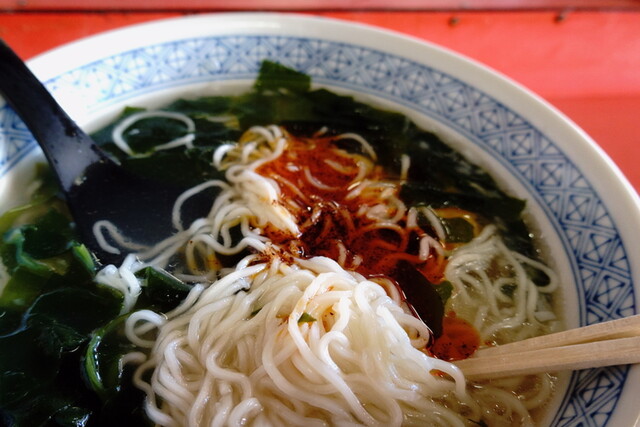 透きとおる“スープ”と、少し縮れの入る“細麺”、そして“スープ”に浮かぶ具材と言えば微塵切りの“生玉ねぎ”が少々、この3ツの素材が”ラオシャン”さんのデフォルトの“タンメン”です。