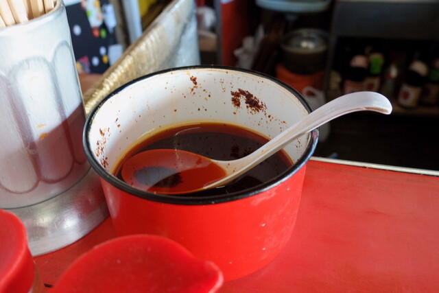 店内のカウンターの天板も赤く、卓上の調味料は“お醤油”、そして“タンメン”必須アイテムの“お酢”、そして“自家製のラー油”がホーローの器に入っています。