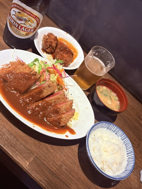 あらかじめ決めていた、ビーフカツ定食ご飯半分、クリームコロッケ、メンチカツ、ビールを注文。