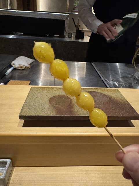 つくねは、生でびっくり!きんかんとともに手巻きスタイルで食べました。弾けるきんかんとねっとりつくねが口の中で混ざり合い、ユッケみたいな感じでした。