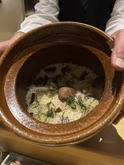 〆は、季節の土鍋ご飯と鶏中華そば。土鍋ご飯は、梅とさつまいもでした。梅の酸っぱさとさつまいもの甘さで不思議な味でした。食欲そそられてバクバク食べちゃいました。鶏中華そばは、鶏スープが美味しすぎた!