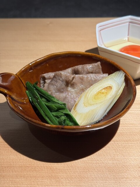 和牛関東風すき焼きは、王道のすき焼きって感じでした。千住ネギと九条ネギも入っていて甘くて美味しかったです。