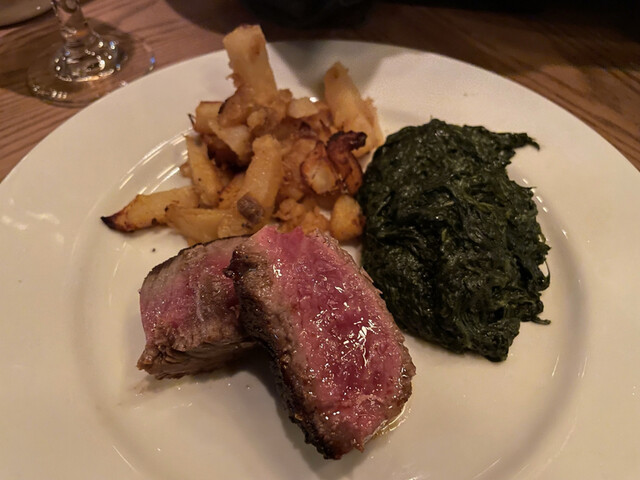 USDAプライムビーフ スライストマト&オニオン ジャーマンフライドフライ クリームドスピナッチ チーズケーキ ピーカンパイ