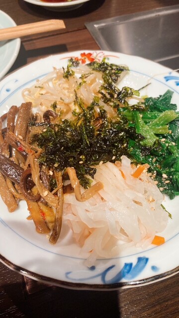 ナムルは盛り合わせの上に韓国海苔が乗っていて、全部混ぜて食べるスタイル。