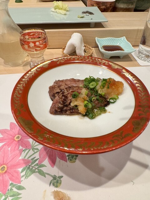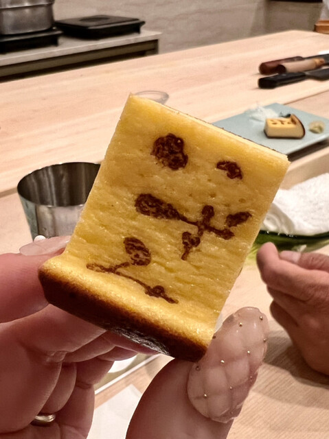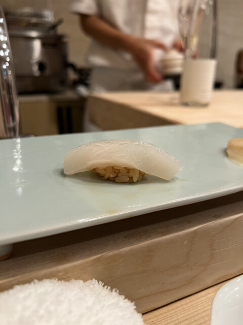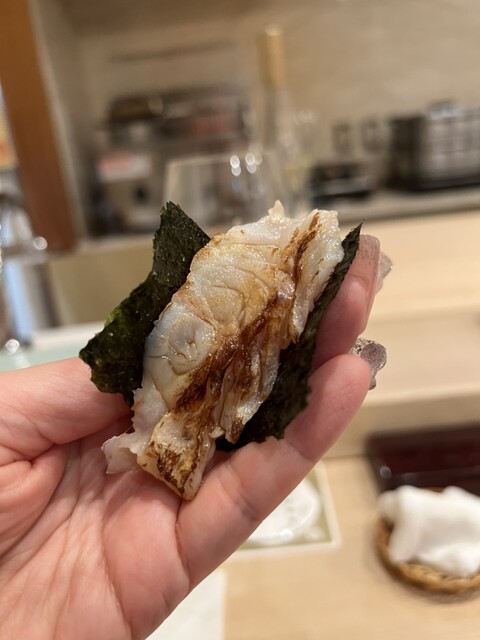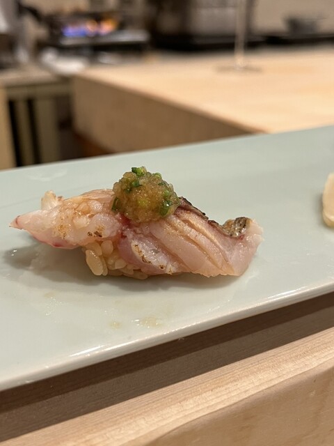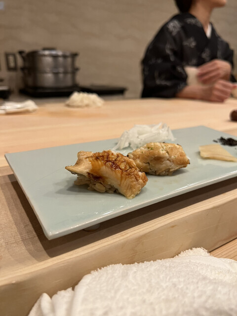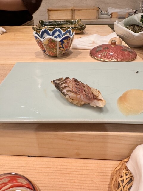 温かいお寿司。鯛の皮が揚げてあってウロコがサクサクでふわふわのノドグロとの食感が楽しい!美味しい!