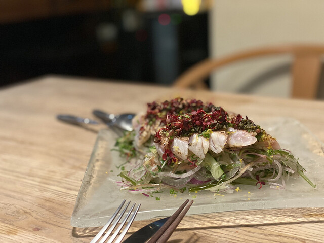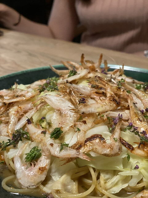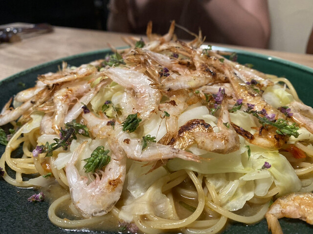白海老、キャベツ、紫蘇の花。出汁ソース。2,390円