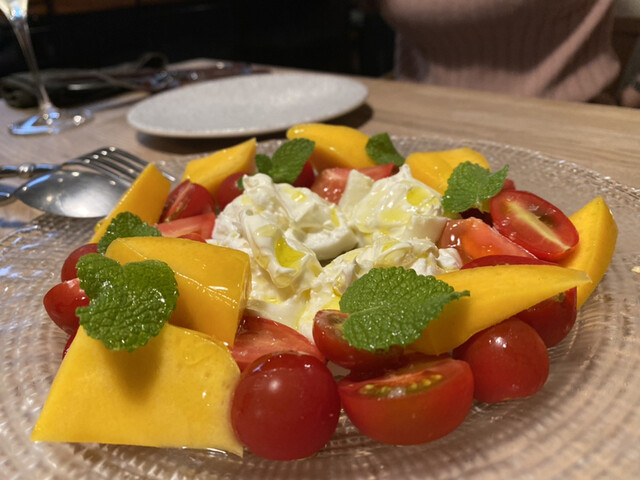 ブッラータチーズとブルートマトとマンゴーのカプレーゼ