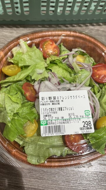 「彩り野菜のアレンジサラダベース(27kcal)」「カロリー65%カット おろし玉ねぎドレッシング(33kcal)」「千葉県産 焼きいも(紅はるか)(100g当たり134kcal)」を買いました。