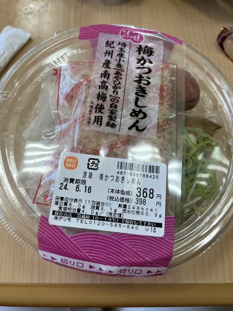 今日の気温は30℃で暑いので、あっさりとしたものを食べたくて「梅かつおきしめん(248kcal)」を買いました。