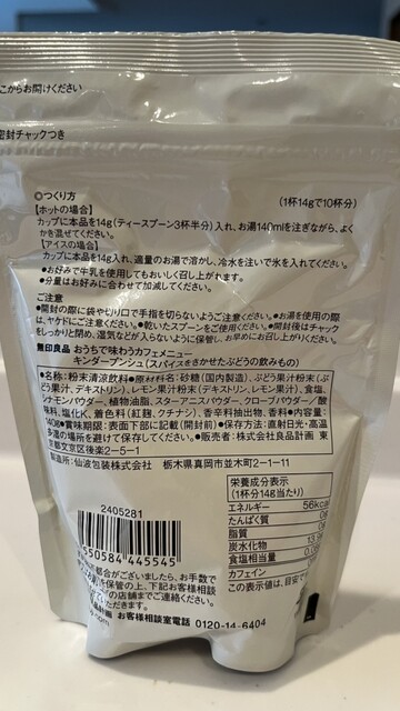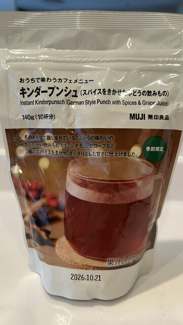 私がプレイしている某ゲームの中で、色んなキャラが「キンダープンシュ」を飲む、というイベントシーンが出てきて、そのシーンを見ていたら私も飲みたくなったので、無印良品で「キンダープンシュ(スパイスをきかせたぶどうの飲みもの)」を1袋買いました。