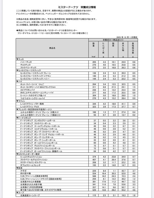 ミスタードーナツ 栄養成分情報