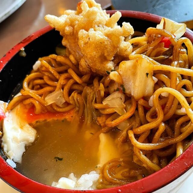 焼きそば丼ひつまぶし風(スープを全部入れてお茶漬け風に食べると衝撃の美味しさに変わります)