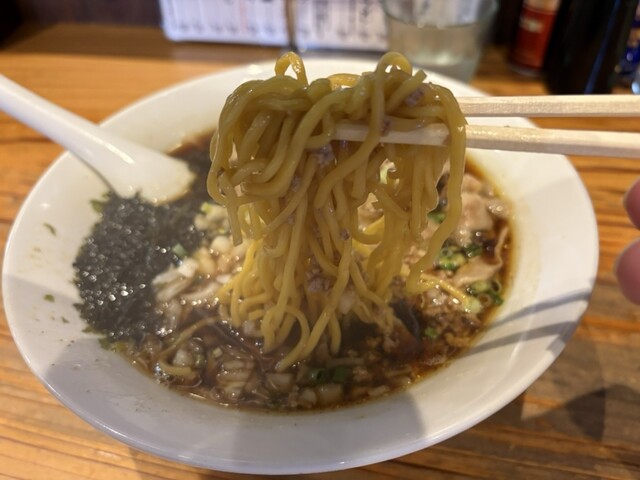 私はたぶん初食の「肉そば」 少し酸味のあるスープに・岩海苔・バラチャーシュー・中太ストレートモチモチ麺が絡んでこれまた美味ー。途中で卵を溶かして味変。これもまた良し。