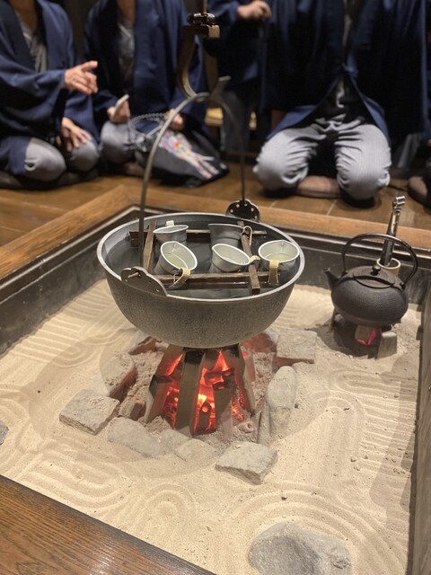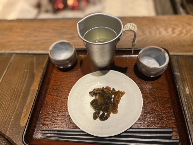 到着して囲炉裏を囲んで、おやきと蕎麦茶のサービス。夕食前には、熱燗とお漬物のサービス。嬉しいなー