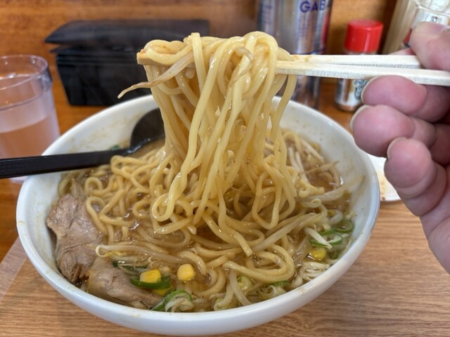 ボリュームがあって中太ストレート麺のモチモチ感と辛味噌を溶かしたスープがだーいすき❤️