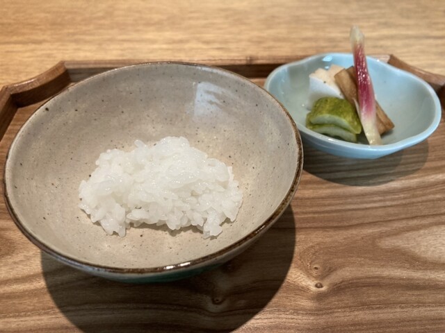 まずは炊き立てのごはんをそのまま。お新香も上品で美味しい。