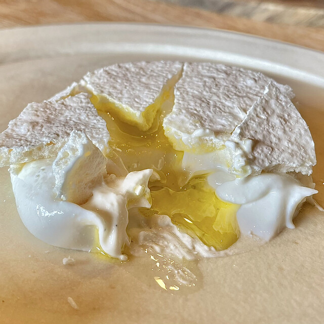 スペシャリテの自家製リコッタチーズはヒッコリーで香り付けされていて、メレンゲの程よい甘みと、割ったときに中から流れ出てくるオリーブオイルとのバランスが秀逸。