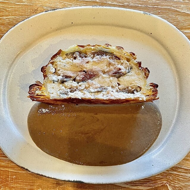 パイ包みは鰯とムース状の帆立を包んでいて、ソースも鰯の内臓を使ったソース!エグみや生臭さが出てしまいそうなのに全く臭くなくてびっくり。