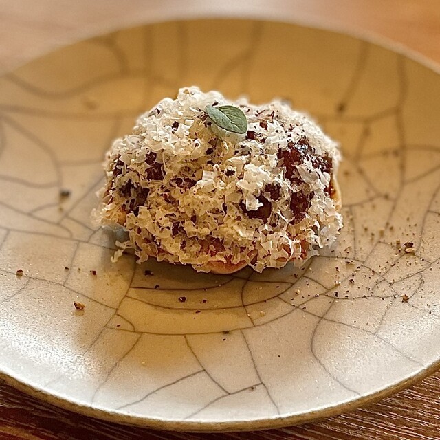 もうひとつのスペシャリテの『自家製リコッタチーズ』は、ヒッコリーの燻製やスターアニス、八角で香り付けされていて、メレンゲの程よい甘みと、割ったときに中から流れ出てくるオリーブオイルとのバランスが秀逸。KAMでしか食べられない特別なお料理でこちらも大好きです。