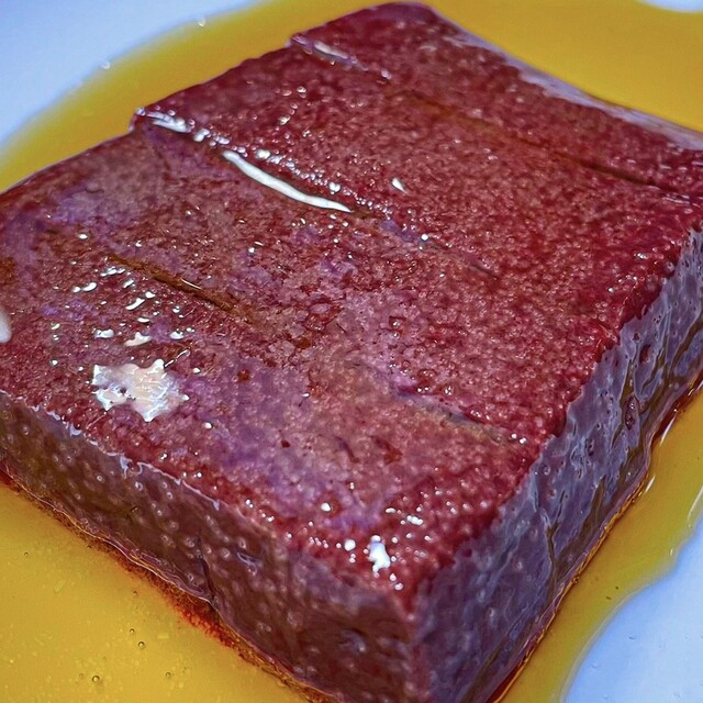 赤身角切はヒレみたいにしっとり柔らかく食べられるようにリョンスさんが加工してくれているので、表面の色が変わるくらいのレアに焼いて食べるのがおすすめ。厚切りなのにしっとり柔らかくてほんとにうんんまい♡