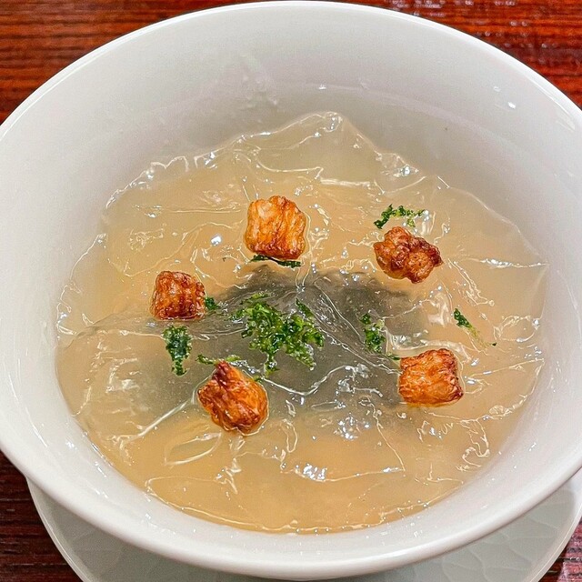 天然の鯛出汁煮凝り、独活、揚げ長芋