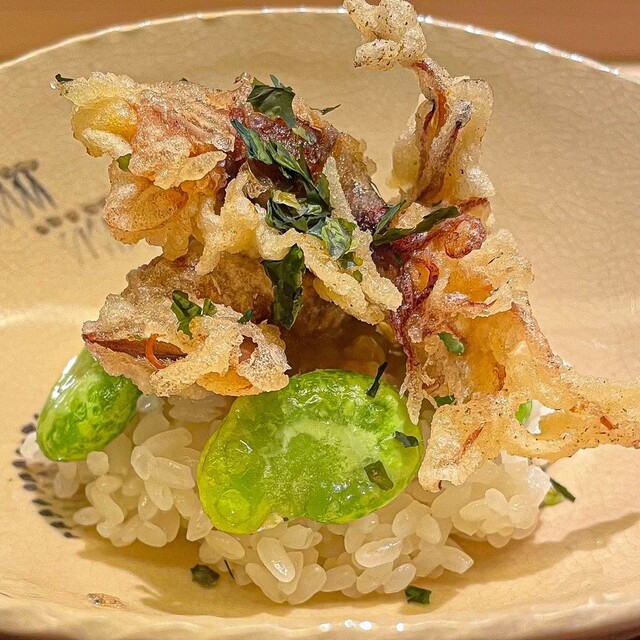 ▫️からすみ天、百合根素揚げ、飯蒸し