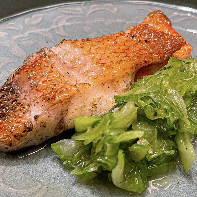 金目鯛の藁焼きは絶妙な火入れ。奥で藁焼きして、カットして、ってしてる山﨑さんを見てるときは鴨かな?と思ったけどまさかの金目鯛だった!パリパリの皮面とレアな身のコントラストたるや。付け合わせの黄韮のぬた和えもおいしい…
