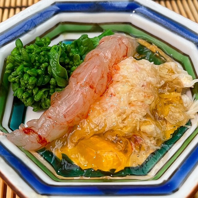 名物の「おはぎ」や「あん肝とすいかの奈良漬け」「金目鯛の皮炙り」などはほとんどの場合ではおまかせでは出てこなくて追加から頂けますが、この日はおまかせにあん肝すいかが出てきた♡