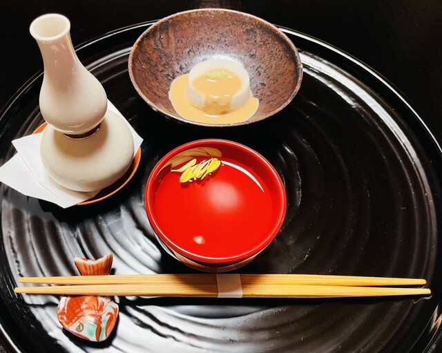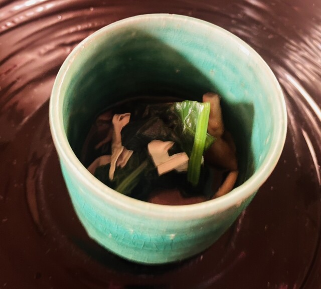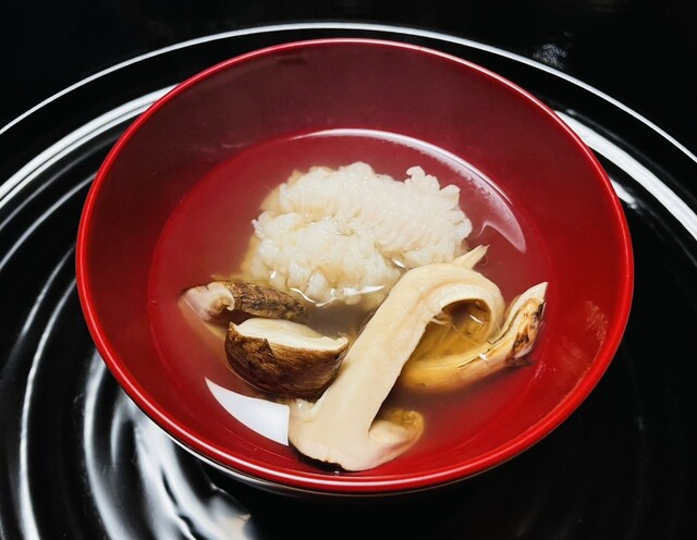 ※ 生姜がしっかり利いたすり流しが身体を温めてくれ、かつ舌喜ばせる。焼き目のついた九絵の身の旨さ加わって、華やかな御碗に。
