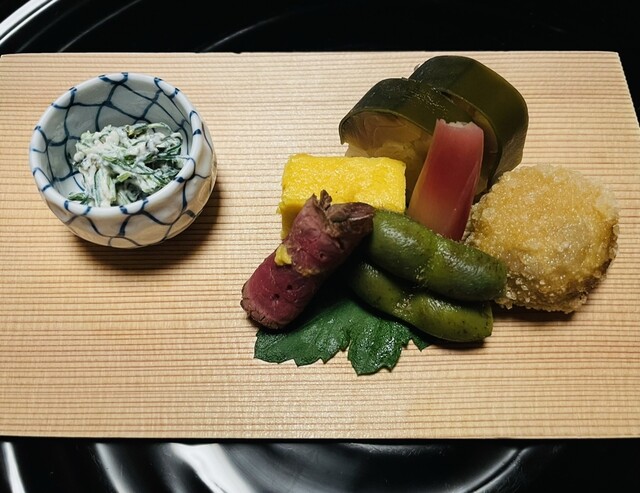 美しい盛り付けの八寸。季節を感じる個々の食材は、いずれも仕事が丁寧で、「次はどれを食べようか…」と箸を迷わせる魅力がある。良き。