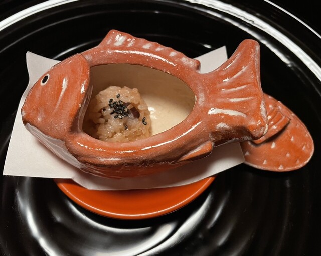 トロける賀茂茄子がめちゃ旨いな。柔らかい富士鶏に、蕨の食感が面白く、花山椒の香りが華やかに全体を包み込む。あぁ、美味しぃ。