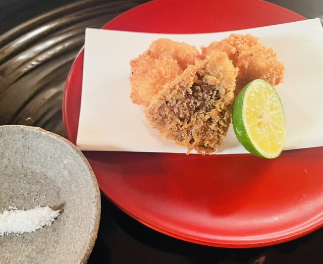 強 肴 海老芋おかき揚げ 黄身辛子醤油 酢橘