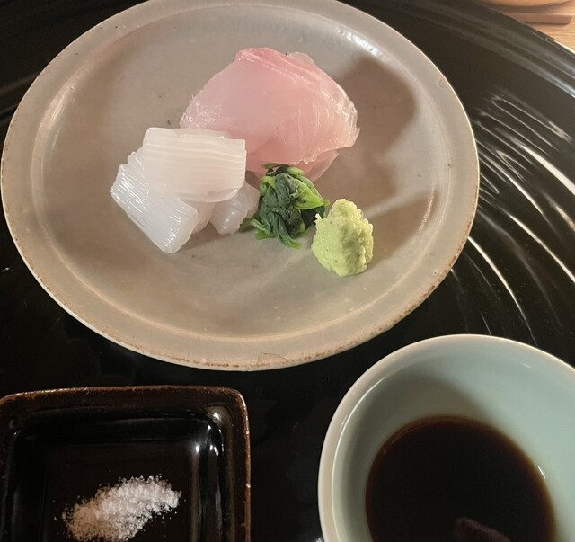 ※ 『石葉』さんのお造りのクオリティはいつも素晴らしい。今回は、鯛と伊勢海老です。醤油だけでなく、煎り酒が供されるのもポイントが高いですね。