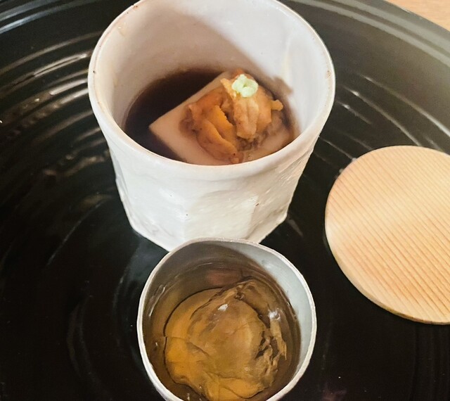 何より出汁が美味しい御碗。ふっくらしたアイナメの身質の良さに、旨味もしっかり。秋田産のジュンサイのトゥるんとした食感に、ほくっと臼井豆の青い風味が面白い。また、花柚子の香りがアクセントを添える。美味!