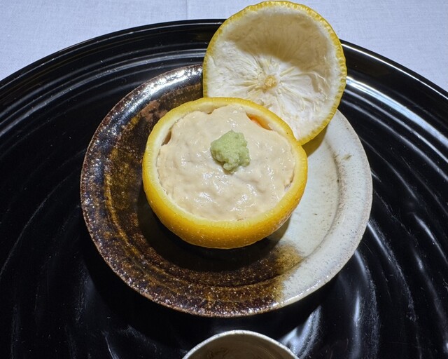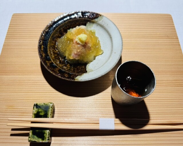 ※ ポン酢餡の風味が「雲子豆腐」を上手く引き立てており、スターターとして期待が高まる逸品。食前酒の果林酒も食欲を適度に刺激するアイテムで良き。