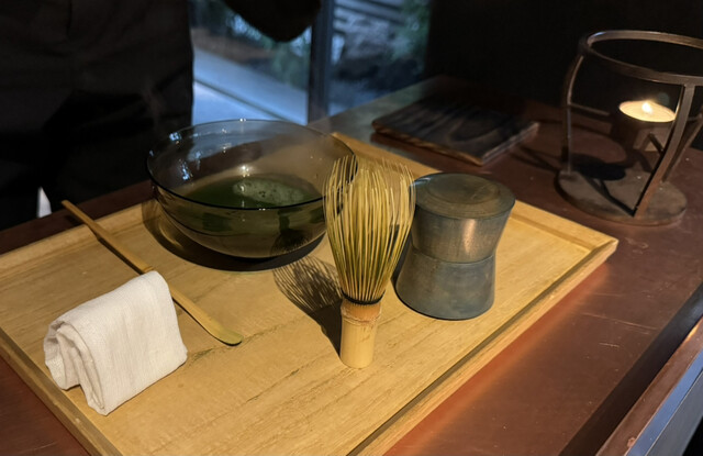 ダイニングへの引き戸が開放され、まず左手には素晴らしい「盆栽」が目に入ります。その後、細く短い廊下を経て、ダイニングに到着するのですが、黒を基調とした落ち着いた内装。窓が大きく取られ、庭の木々、緑が目の前に広がり(上手に外の建物が見えないように考えられている)、表参道という立地にありながら都会に喧騒を忘れさせてくれますね。