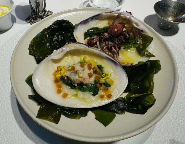 お願いしたのは、「おまかせコース(約8品)」で、価格が56,925円(税金・サービス料込)也。加えて、ワインペアリングもオーダーしました。いただいた具体的な内容は、以下のとおりです。