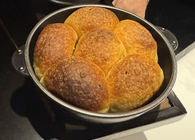 「フォカッチャ」は、小ぶりな鉄鍋(スキレット?)に入っている状態で、Food Presentationがあり、その後、取り分けてくれます。「フォカッチャ」は、ジャガイモの香りが豊かで、塩味が最高の塩梅。「古代小麦入りパン」は、もっちりした食感で、しっかりした酸味があって面白い。