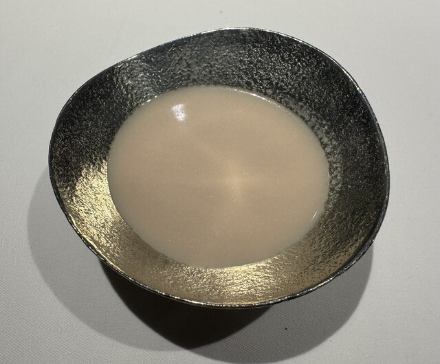 加えて、コースに含まれる一献も素晴らしい。「羽根屋純米吟醸煌火生原酒」の熱燗を、「コブミカンの葉」と「白胡椒」を砕いたものに潜らせ、ぬる燗くらいの温度でお猪口(能作さんの錫製)一杯分をサーブして下さいました。