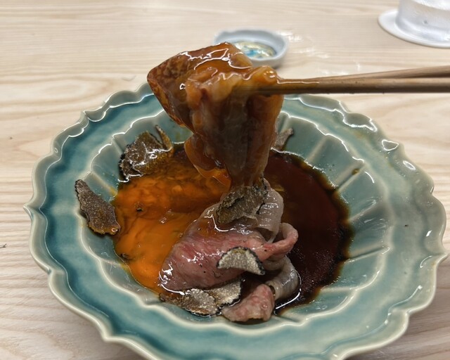 •すき焼き割烹日山の黒毛和牛すき焼き 卵黄添え