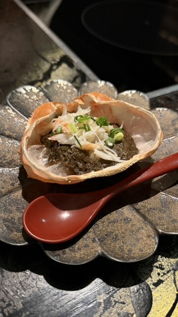 旬の野菜を使った前菜が始めに3皿出てくるので、お腹に負担なく緩やかにスタート。蕪の擦りながし、冬野菜のお浸し、リブロースの炙り、蟹味噌という内容でした。少量ずつ味わえるのが嬉しかったです。