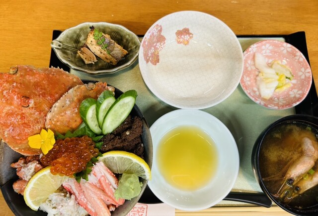 セイコ蟹の他イクラも入って、小鉢の鮭とエビの味噌汁・漬物とすごいボリューム