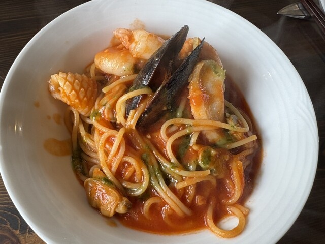 魚介のトマトソースは魚介たっぷりでトマトソースが前より美味しかった(˶ˊᵕˋ˵)