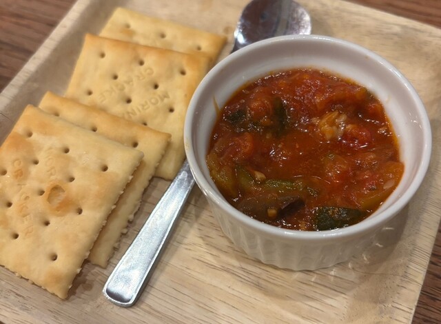 生ハムと季節のフルーツのコカ、まるでさっぱりとしたデザートかと思うくらい、ほんのり甘みがあり