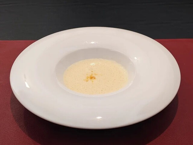 なめらかな流線型のお皿に乗せられて登場したブラマンジェ。クリーミーながらどこかあっさりとした味わいの後、明太子がふわり。明太子の風味の広がり方が奥ゆかしい。