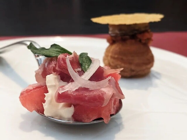 スプーンをタルトに見立てた、スイカのタルト。湯剥きしたトマトにクリームチーズ、甘いスイカ、生ハムが乗せられてる。瑞瑞しい甘さのスイカが浮くことなく、他の具材としっかり合ってて美味しい。